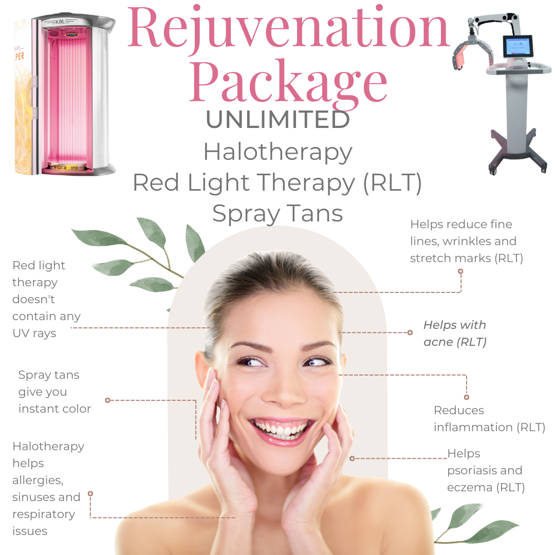 Unlimited use of our spray tans, red light therapy and halotherapy. (Halotherapy only at the Dry Ridge location) Package starts the day of purchase.